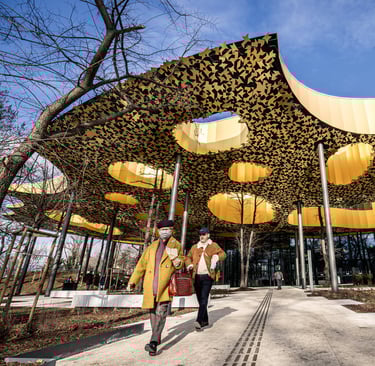 Sou Fujimoto’s creation defies definition: part concert hall, part interactive museum, part sanctuary. The structure refuses to impose itself on the park—instead, it nestles into it. From a distance, it appears like a shimmering pool of sound, as if music had liquefied and settled gently among the elms.